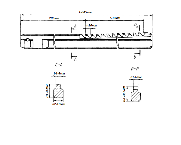 Протяжка шпоночная 6мм с калибрующими зубьями (Р6М5, b1-6мм, H1-15мм, b2-10мм, Н2-18,7мм, L-845мм, z-55, t-10мм)